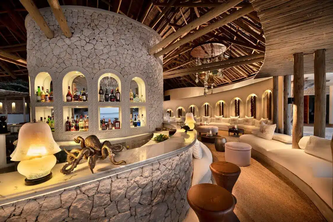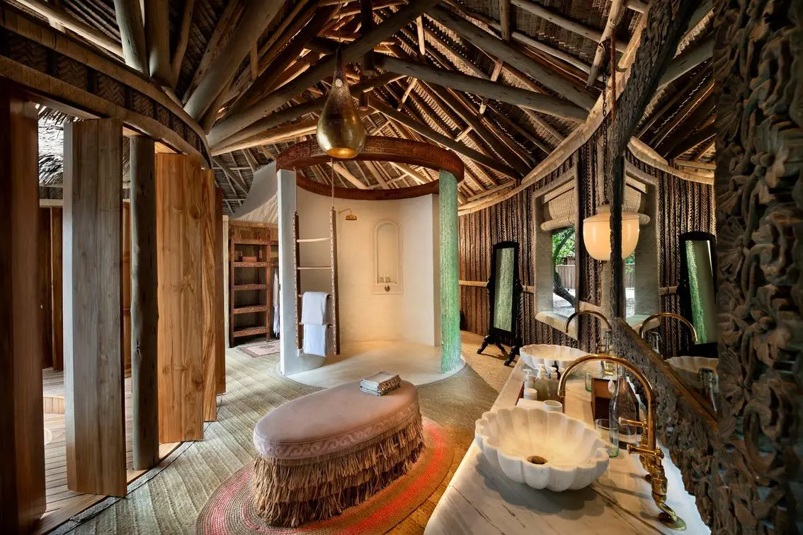 The lodge offers just twelve private bandas set on the beach, each designed in a rustic chic style with palm thatch, natural woods, and open plan layouts that bring the outdoors in. The bandas feature spacious bedrooms, en-suite bathrooms, and private verandas with direct beach access. Facilities include a central dining area serving gourmet meals with fresh seafood and international cuisine, a lounge area with ocean views, and private dining options on the beach. True to the island’s ethos, barefoot luxury is encouraged, and service is discreet yet highly personalized.