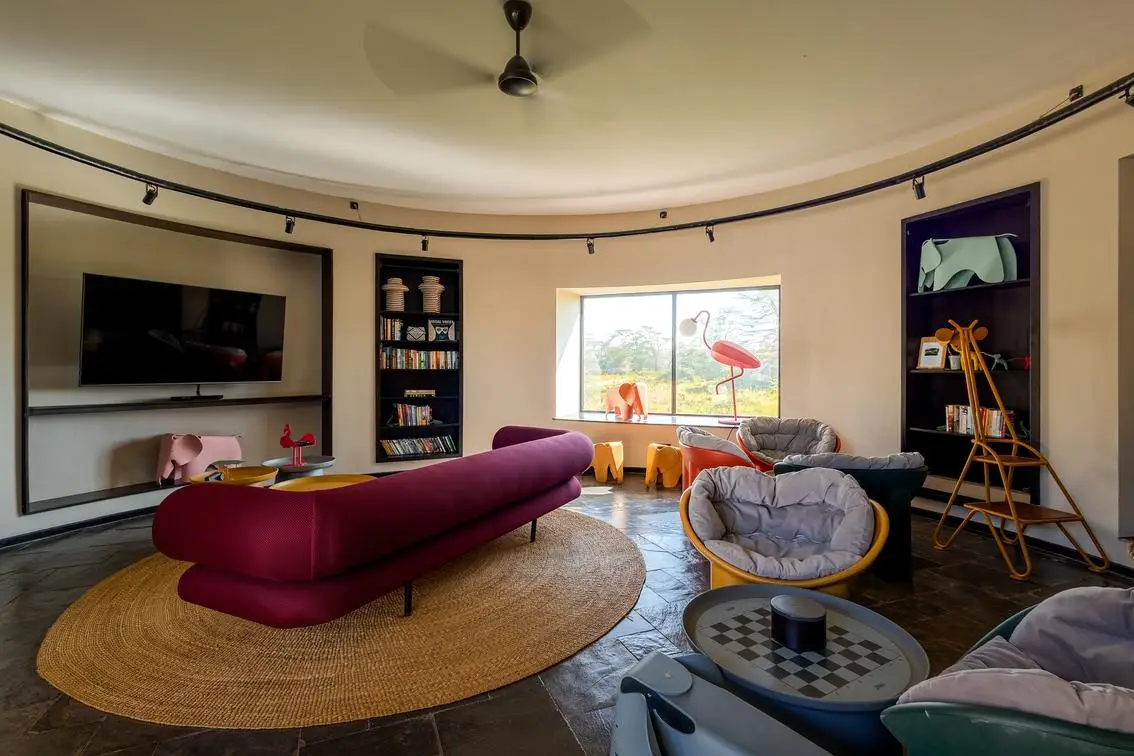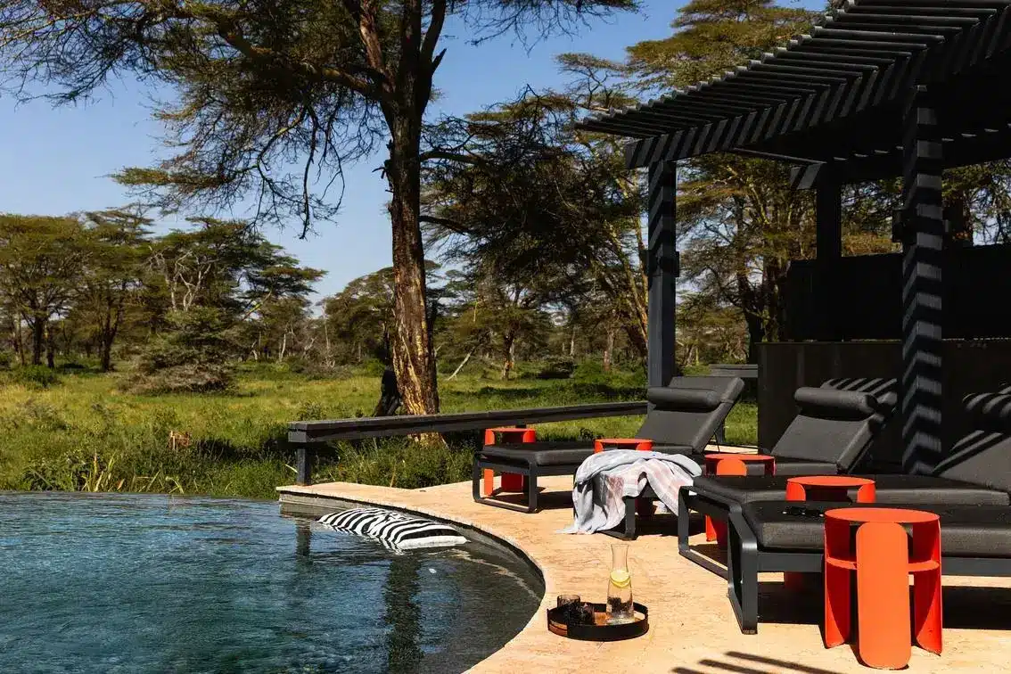 The lodge is built with understated luxury in mind. Central guest areas include a rim flow swimming pool overlooking a waterhole often frequented by elephants, giraffes, and zebra. The baraza lounge and firepit are designed for storytelling under the stars, while the indoor lounge and library provide comfort on cooler evenings. Dining is flexible, with guests enjoying meals al fresco, in the privacy of their decks, or in the central mess area with views of Kilimanjaro.