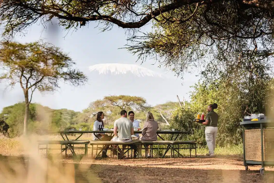 Drinks or meals set in beautiful, remote corners of the sanctuary with Kilimanjaro as a backdrop.