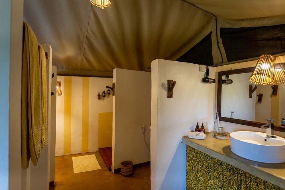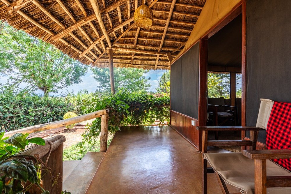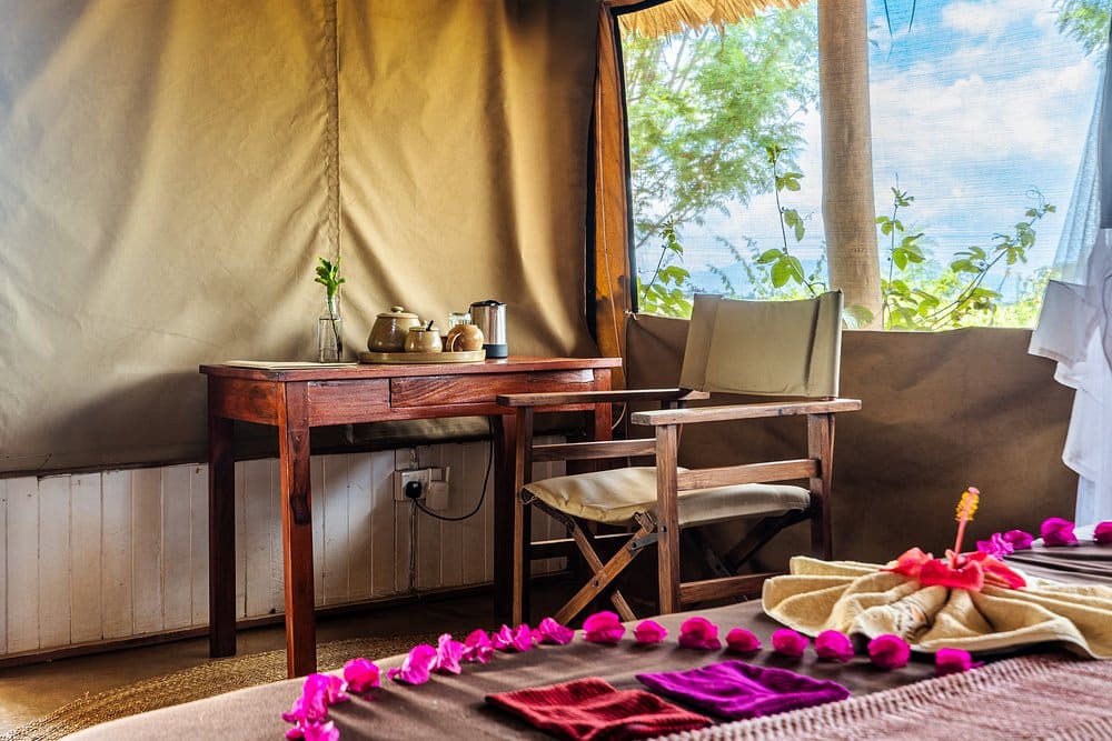 The lodge features spacious, semi-permanent tents elevated on wooden platforms with private verandas overlooking the surrounding gardens or forested hills. Each tent is equipped with comfortable beds, en-suite bathrooms, hot showers, and eco-friendly amenities designed to minimize environmental impact. Interiors are tastefully furnished with natural materials, blending rustic charm with modern comfort.