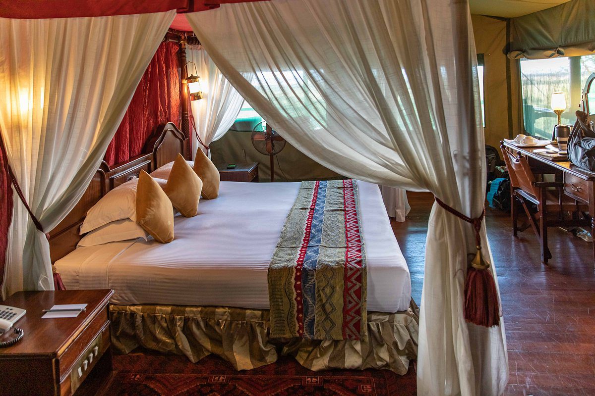 Kirawira Serena Camp features 25 luxury tents raised on wooden platforms, each offering Spacious interiors with king-sized or twin beds, draped with mosquito nets. En-suite bathrooms with flush toilets, hot showers, and antique Edwardian-style fixtures. Private verandas with sweeping views of the Serengeti plains. The tents are elegantly furnished with Persian rugs, campaign-style furniture, and soft, neutral tones, creating a refined yet cozy atmosphere that reflects the charm of a bygone safari era.