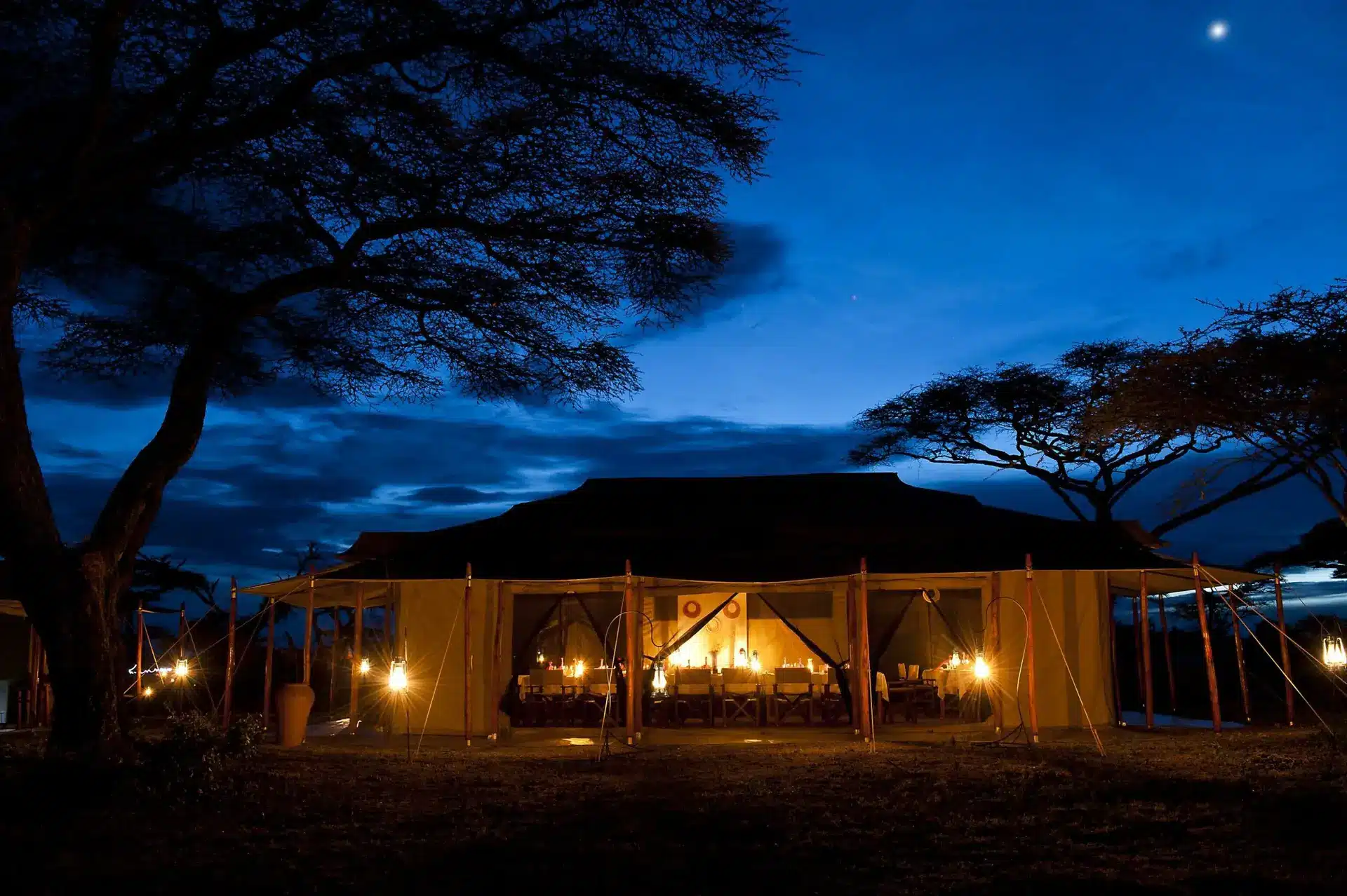 A large dining tent serves freshly prepared meals that blend local and international cuisines. The lounge area provides a relaxing space for reading and unwinding after a day of adventure. In the evenings, guests can gather around the campfire area, where they can enjoy drinks, share safari stories, and stargaze under the vast African sky.