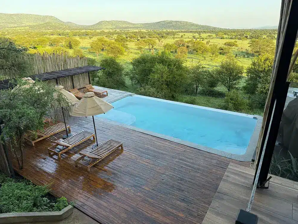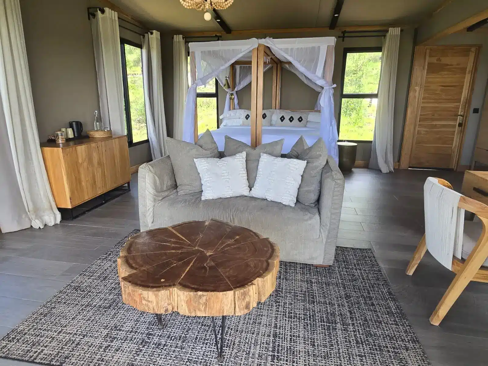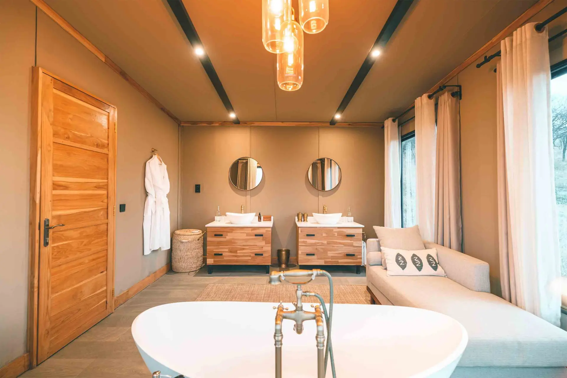 The camp features luxurious canvas tents, elegantly furnished with king-size beds, en-suite bathrooms, outdoor showers, and private verandas offering stunning views of the Serengeti plains. The interiors blend traditional safari style with modern touches, creating a comfortable yet immersive experience.