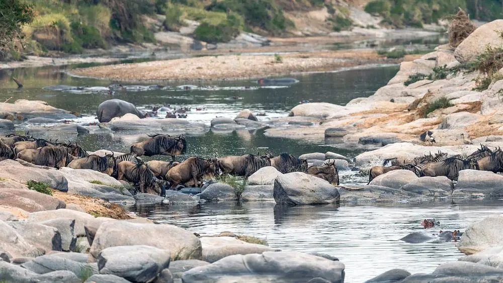 Witness the dramatic river crossings as thousands of wildebeest and zebras battle crocodile-infested waters.