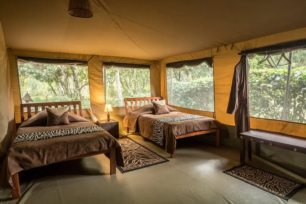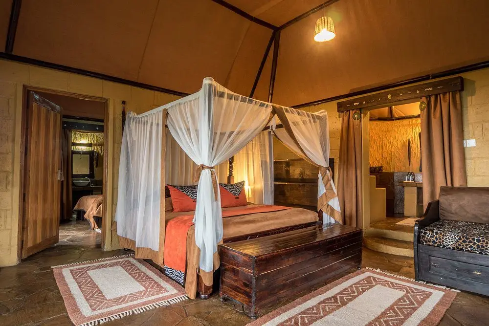 Rhino Watch Lodge offers luxurious chalets, safari tents, and family bungalows, each designed for comfort and privacy. The rooms feature spacious beds, en-suite bathrooms, hot showers, and private verandas with spectacular views.