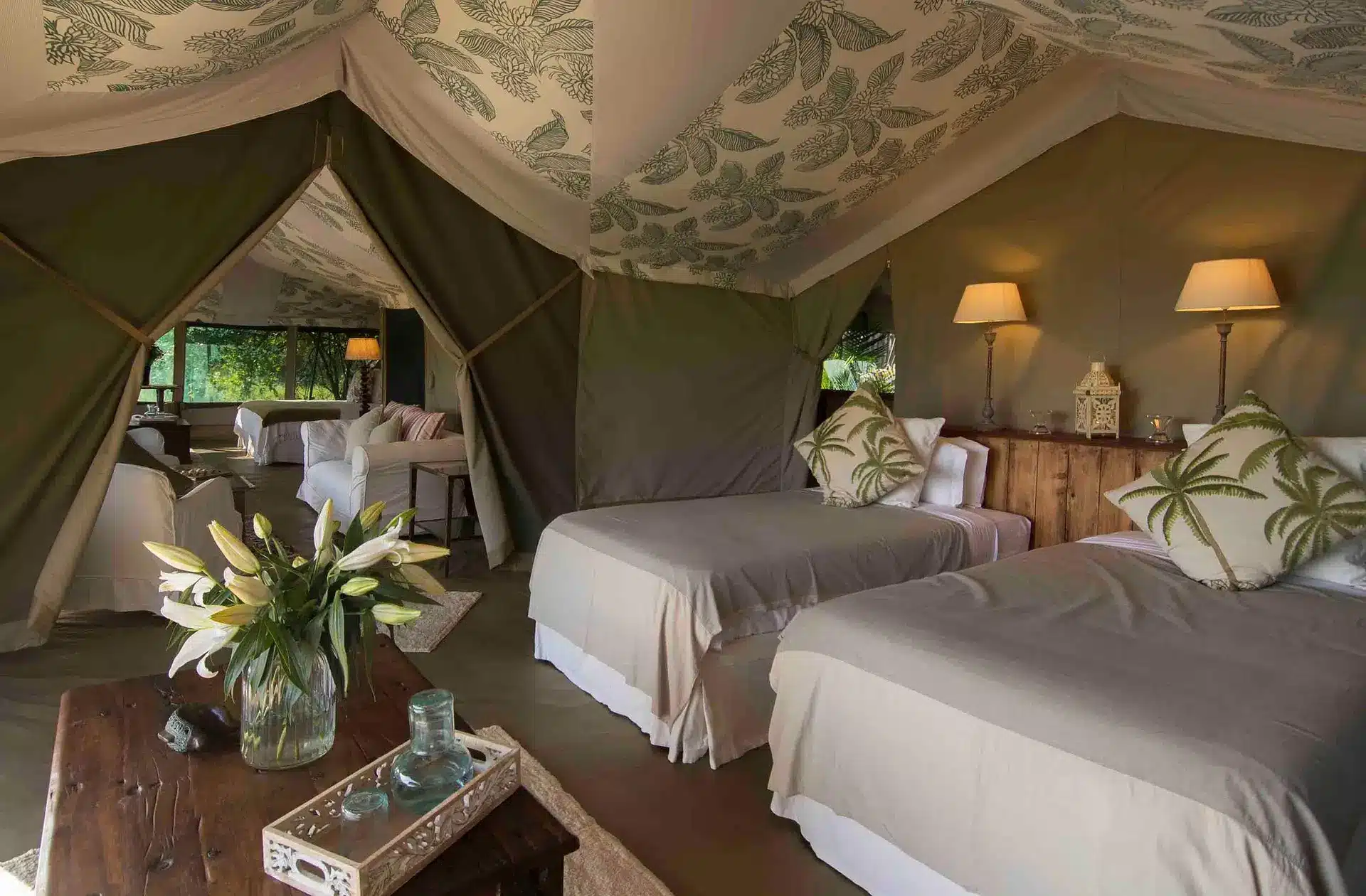 Richard’s River Camp has just seven individually styled luxury tents, including a family suite that can host up to six guests. Each tent is elegantly designed with soft earth tones, hardwood floors, and locally inspired furnishings. The interiors are airy and luxurious, featuring king or twin beds, en-suite bathrooms with flush toilets, solar-heated indoor and outdoor showers, and private verandas overlooking the river.