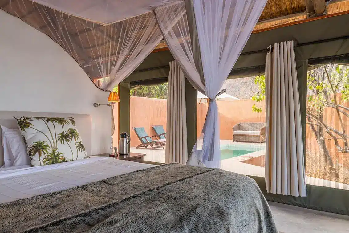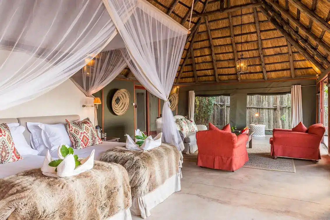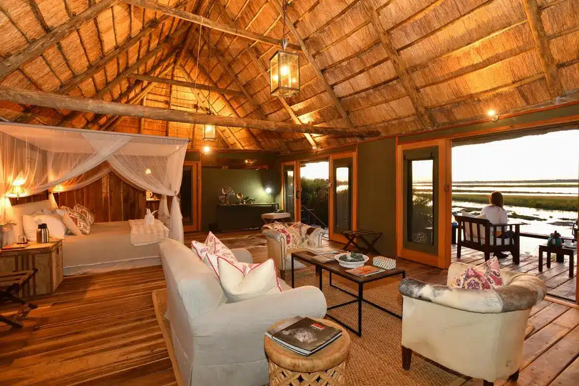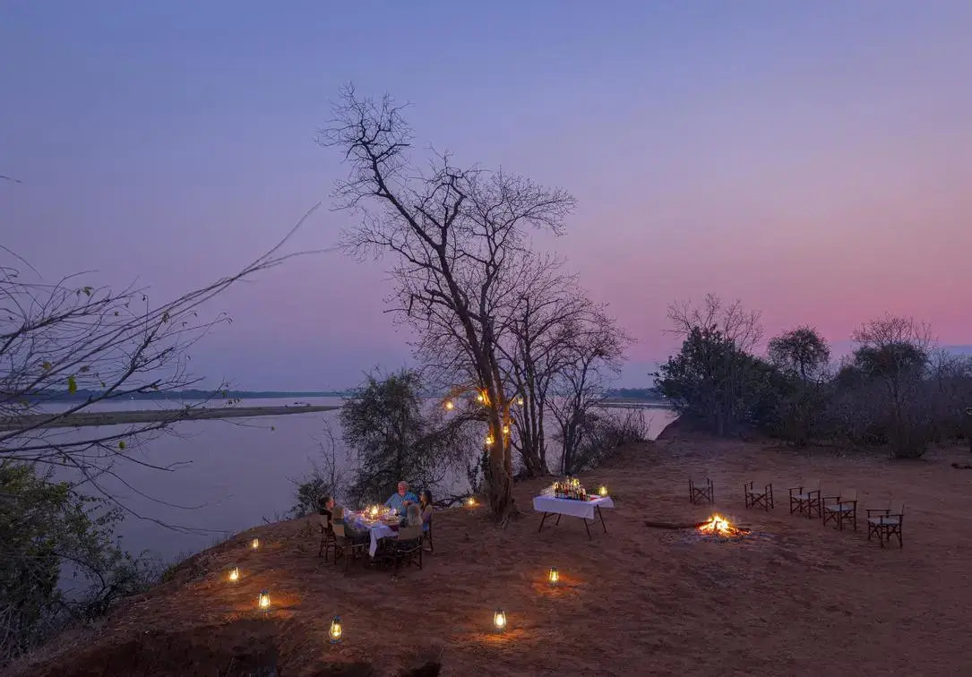The lodge offers a selection of suites and tents, all positioned along the riverbank for uninterrupted views of the Zambezi. The rooms range from classic tents to larger luxury and deluxe suites that include private plunge pools, spacious verandas, and outdoor showers. Interiors feature four poster beds, fine linens, and a mix of traditional safari design with modern amenities. The central lodge area includes an open air dining room, lounge, and bar, along with an infinity pool that overlooks the river. A luxury bush spa provides massages and wellness treatments, creating the perfect balance between adventure and relaxation. Dining is a highlight, with meals often served in scenic outdoor settings or under the stars.