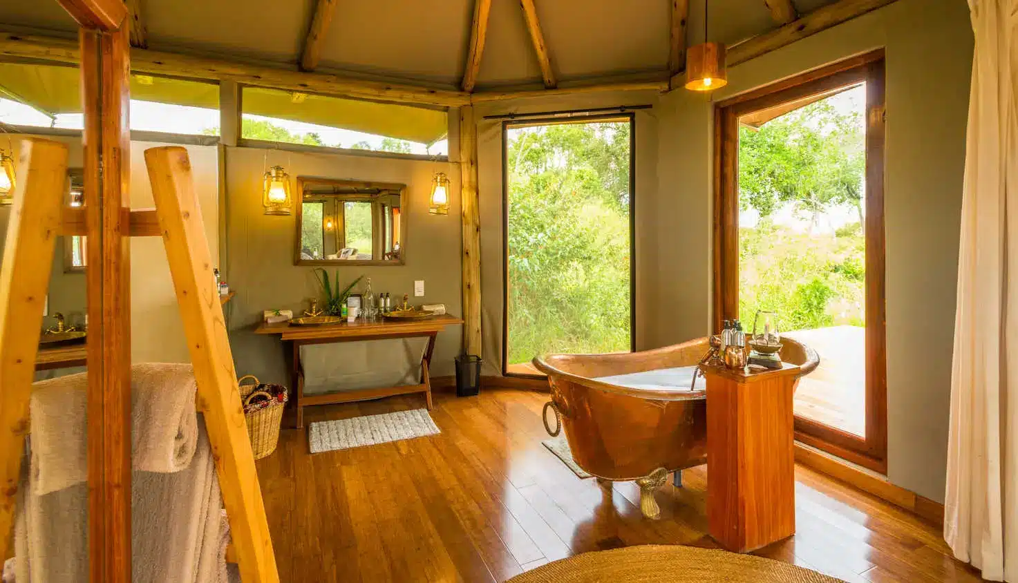 Sala’s Camp features seven luxurious tents, including family and honeymoon suites, all with en-suite bathrooms, indoor and outdoor showers, and private plunge pools.