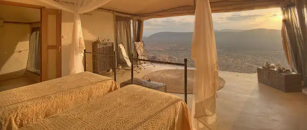 Saruni Camp Samburu is approximately 340 km from Nairobi, taking around 6 to 7 hours by road, passing through Nanyuki and Isiolo.