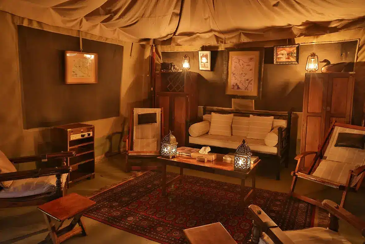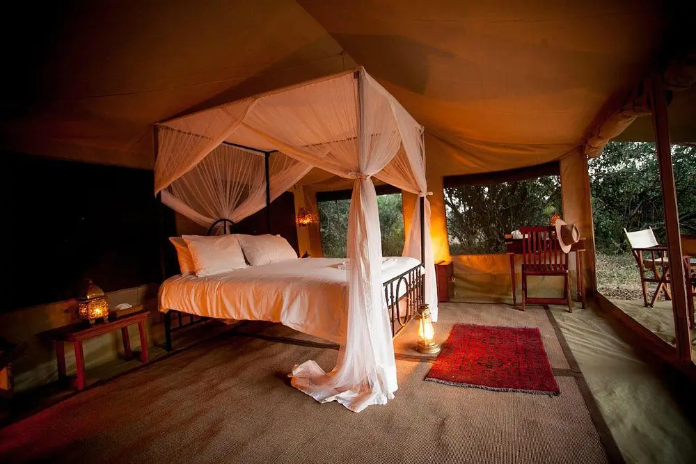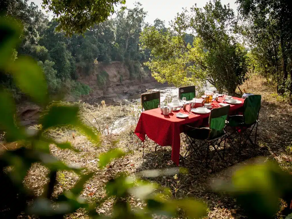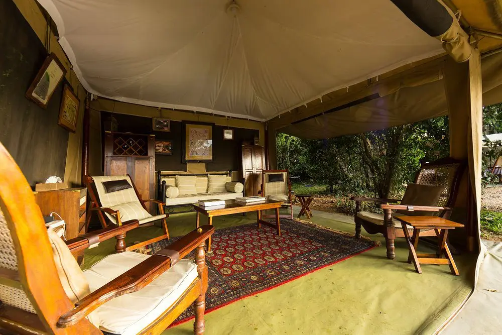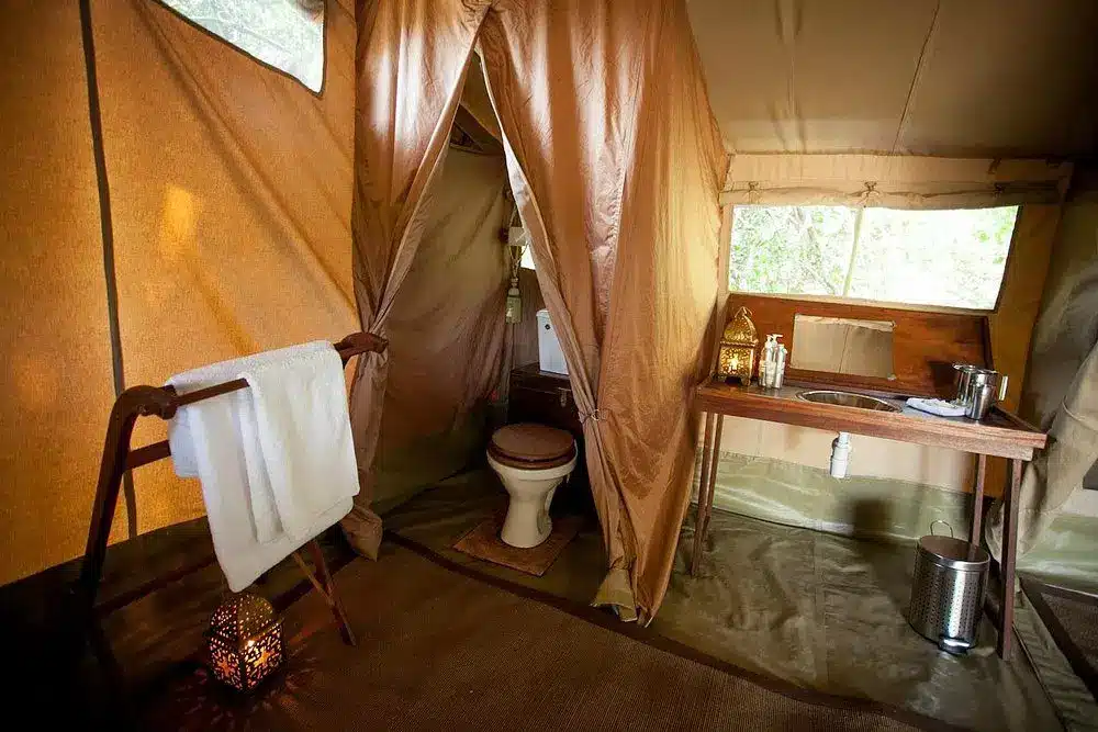 Sentinel Mara Camp has a cozy lounge tent, a dining area serving gourmet bush meals, and a well-stocked bar, all set up to provide a relaxed safari ambiance. Solar power is used for lighting and charging devices.