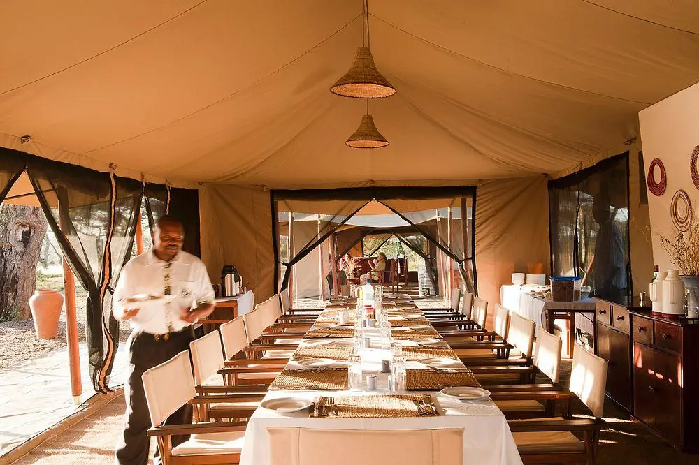 Each tent features an attached bathroom with a hot bucket shower, flush toilet, and eco-friendly amenities. The tents open up to a private veranda where guests can enjoy uninterrupted views of the Serengeti plains.