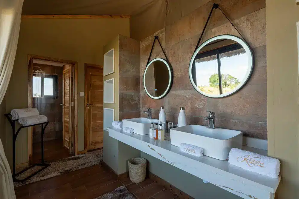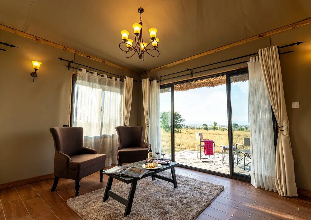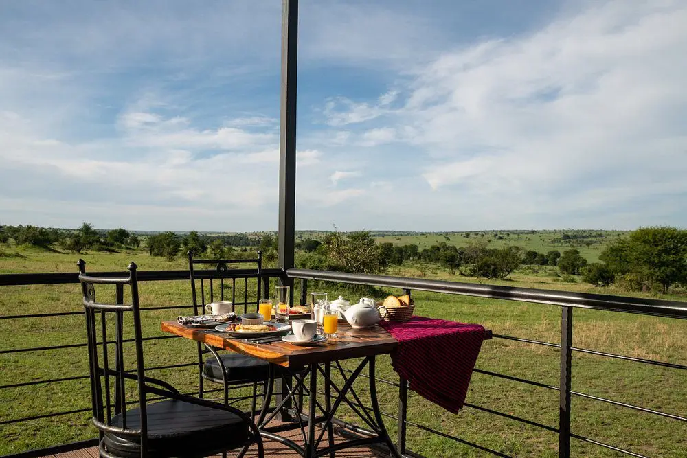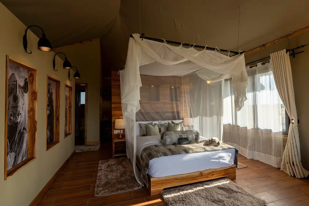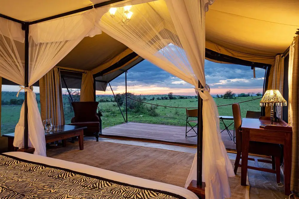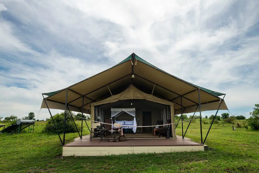 Serengeti River Camp features spacious and elegantly designed canvas tents, each with en-suite bathrooms, hot showers, and a private veranda overlooking the Serengeti plains. The tents are furnished with handcrafted wooden furniture, cozy bedding, and safari-style décor that blends seamlessly with the natural surroundings.