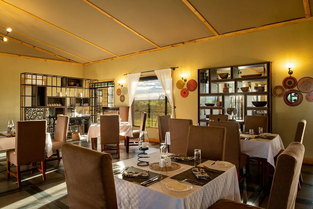 The camp’s main lounge and dining area offer a comfortable space for relaxation, featuring a bar, library, and open-air seating areas with panoramic views. Guests can enjoy freshly prepared meals, including bush breakfasts and sundowner drinks around the campfire.