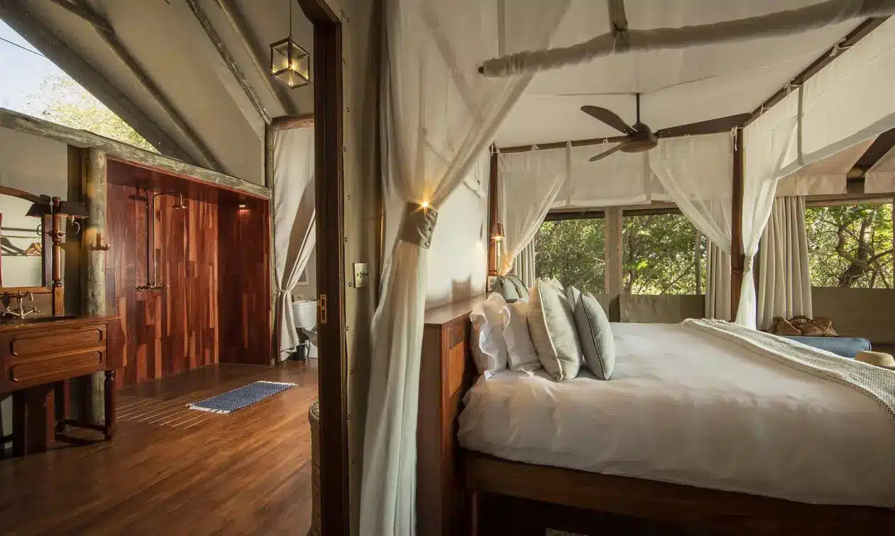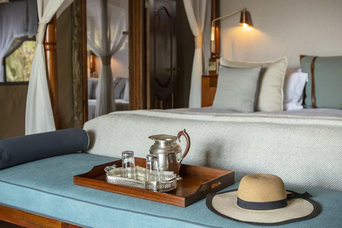 The camp features eight spacious safari tents built on raised wooden platforms, each with an en-suite bathroom, indoor and outdoor showers, and a private deck overlooking the surrounding floodplains. Interiors are tastefully furnished with comfortable beds draped in mosquito nets, writing desks, and lounge chairs, maintaining a traditional yet stylish safari feel. The main area includes an open plan lounge, dining room, and a multi level deck for uninterrupted views of the plains and waterways. A small plunge pool offers a refreshing break during the hotter parts of the day. Meals are freshly prepared and served either in the dining area, al fresco under the stars, or at scenic bush locations. The camp is solar powered and designed with eco-friendly practices to minimize environmental impact.
