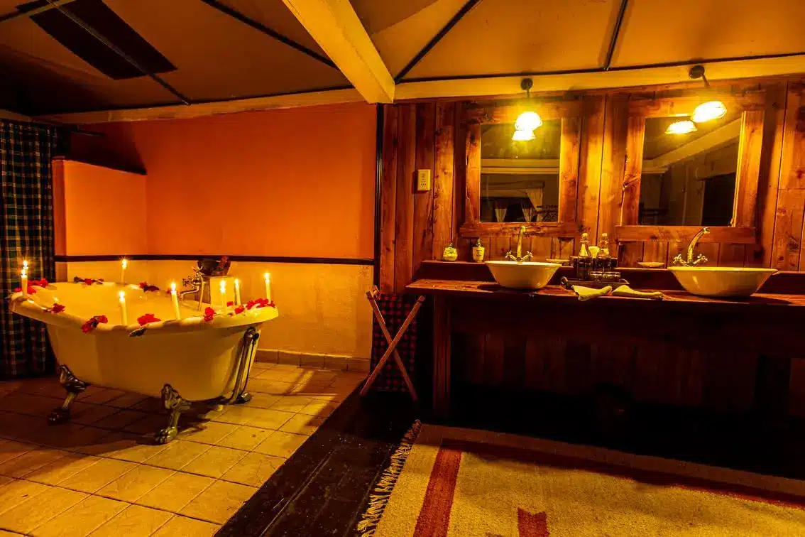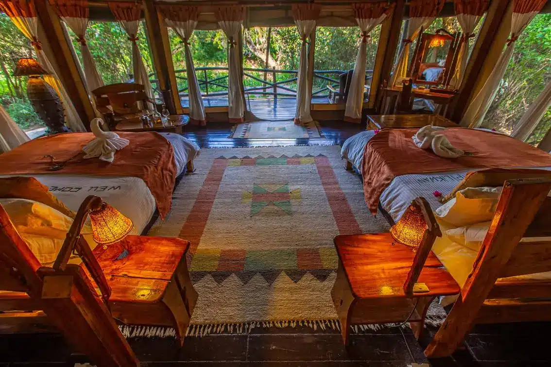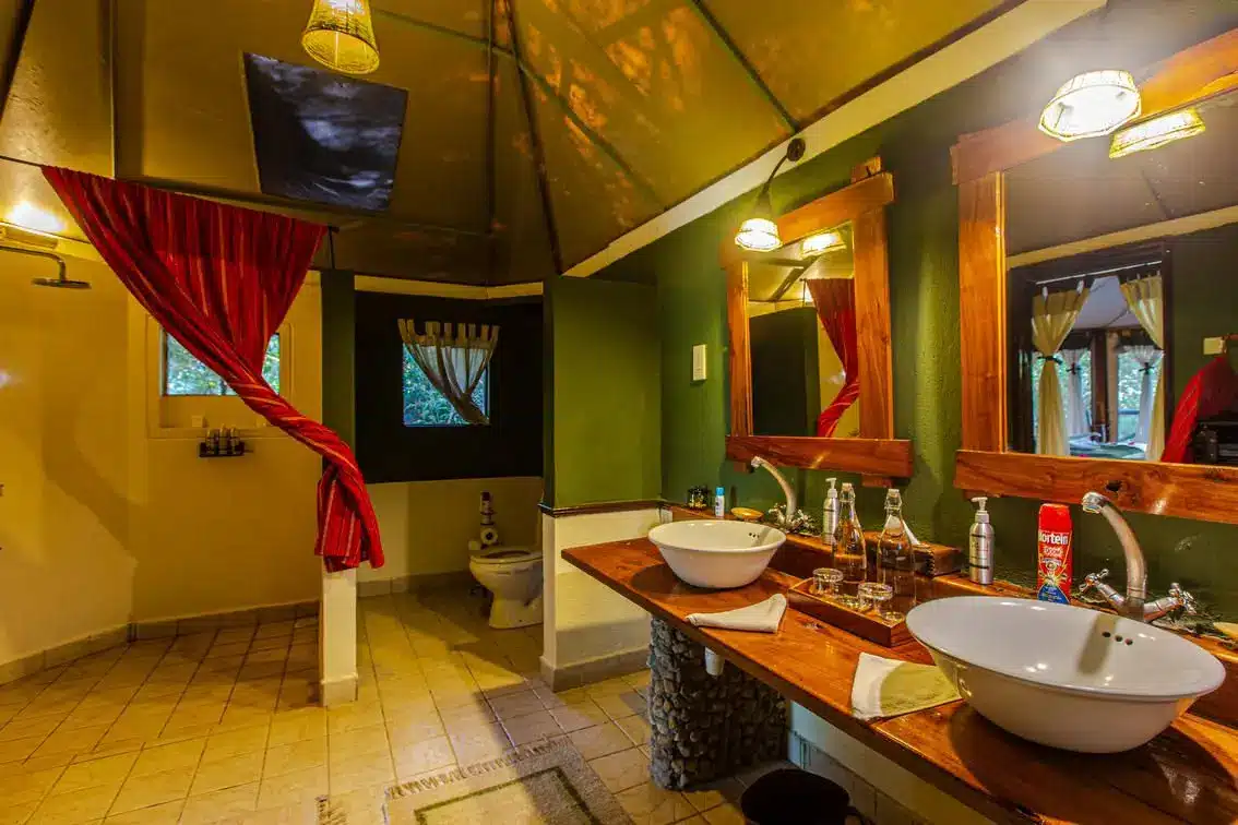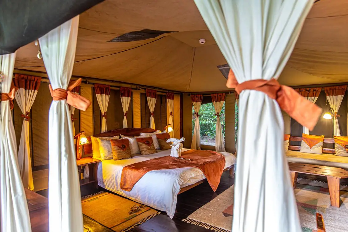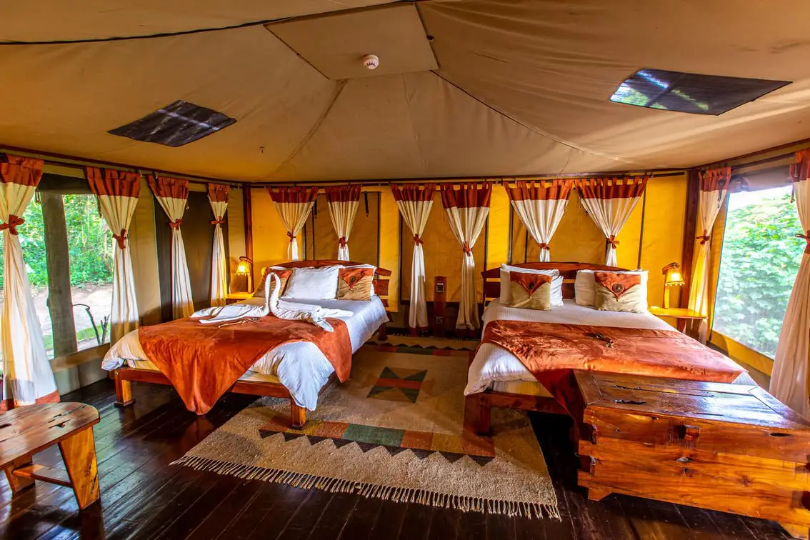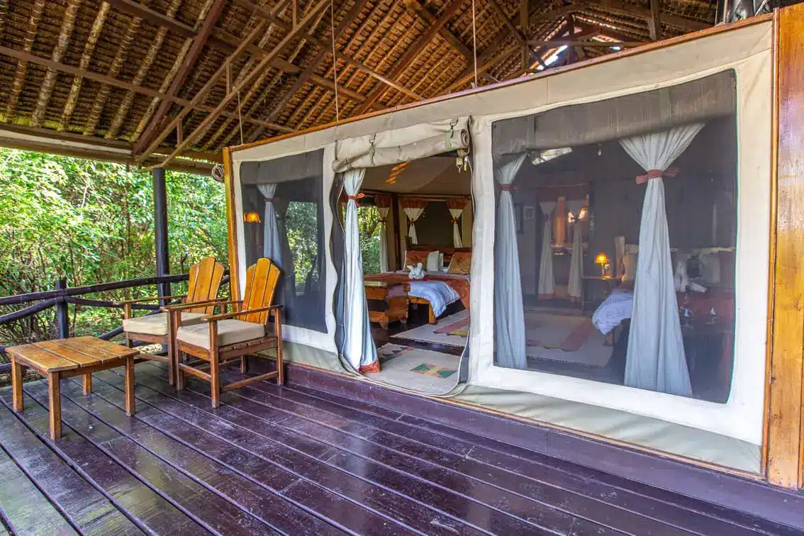 The tents include king-sized or twin beds, en-suite bathrooms with hot showers, flush toilets, and private verandas for relaxing while watching wildlife.