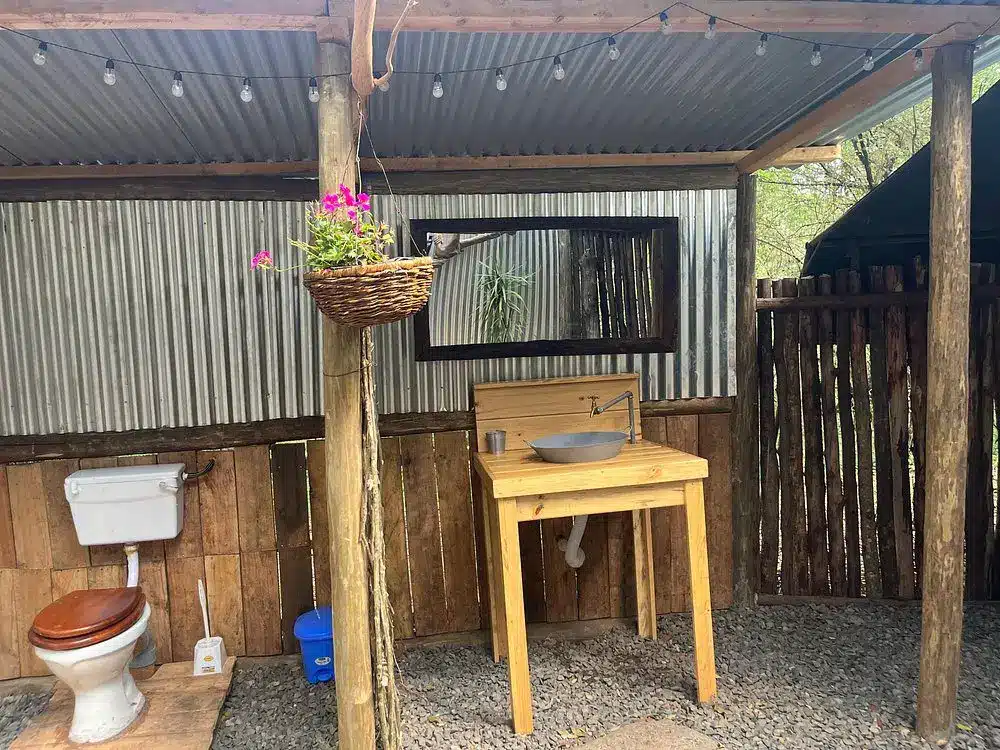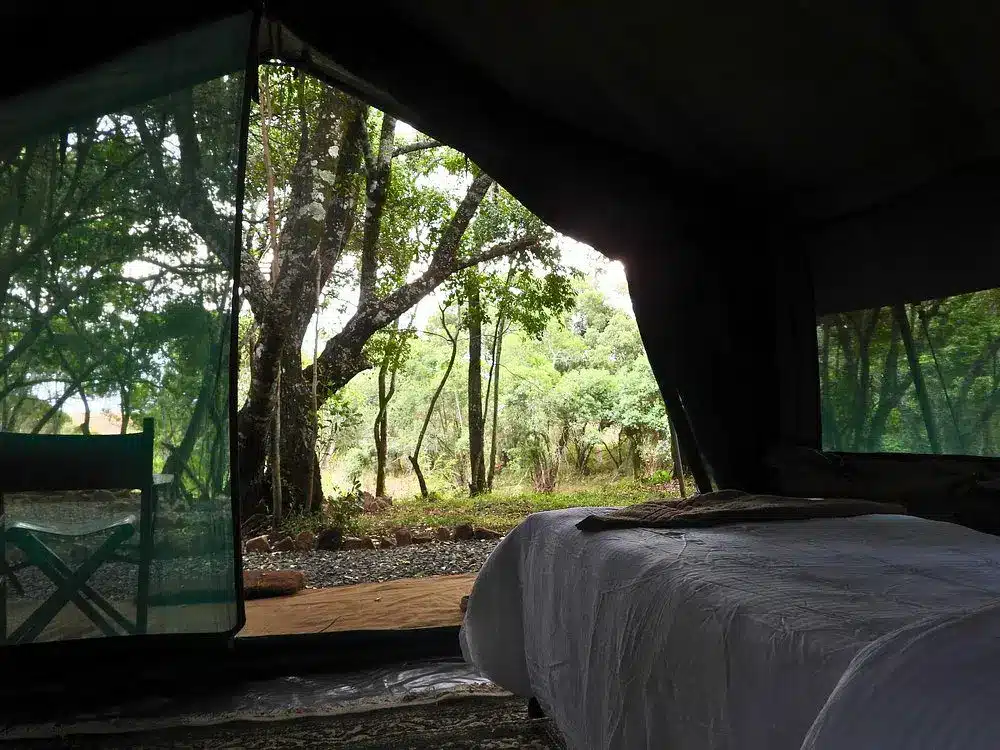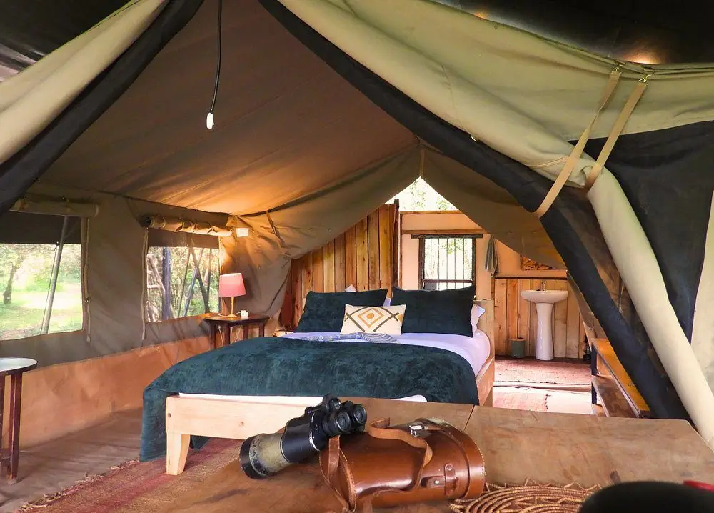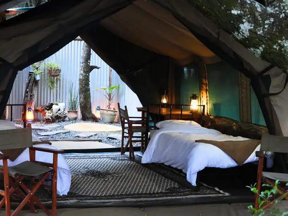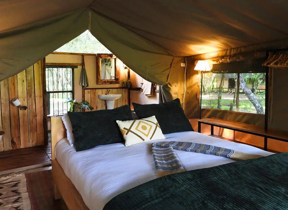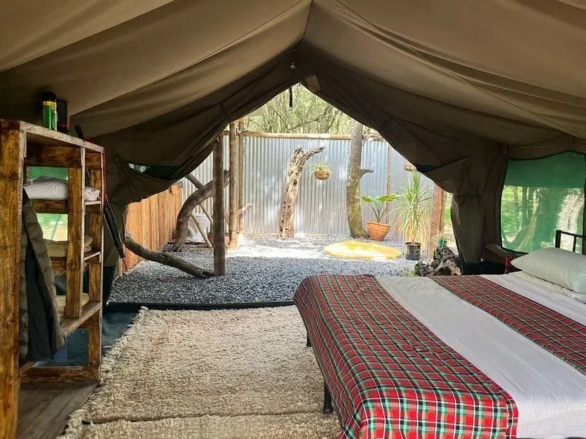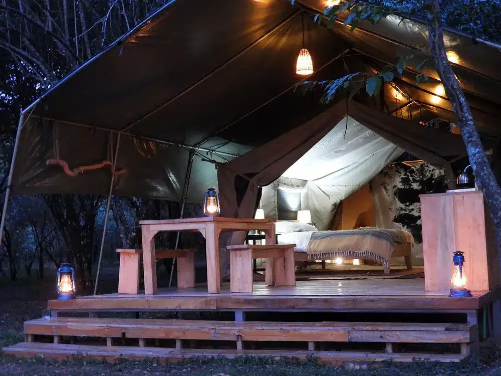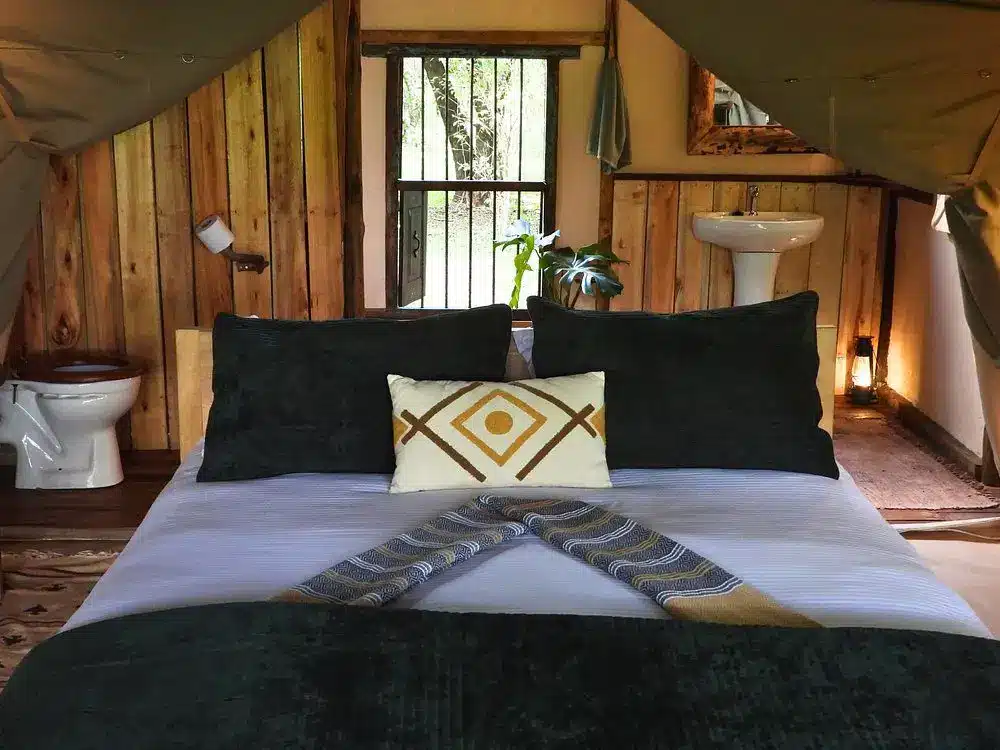 Fully furnished, self-catered tents that provide a comfortable camping experience. Each tent accommodates up to two persons and includes amenities such as en-suite bathrooms with hot showers, electricity charging points, and private verandas overlooking the forest.