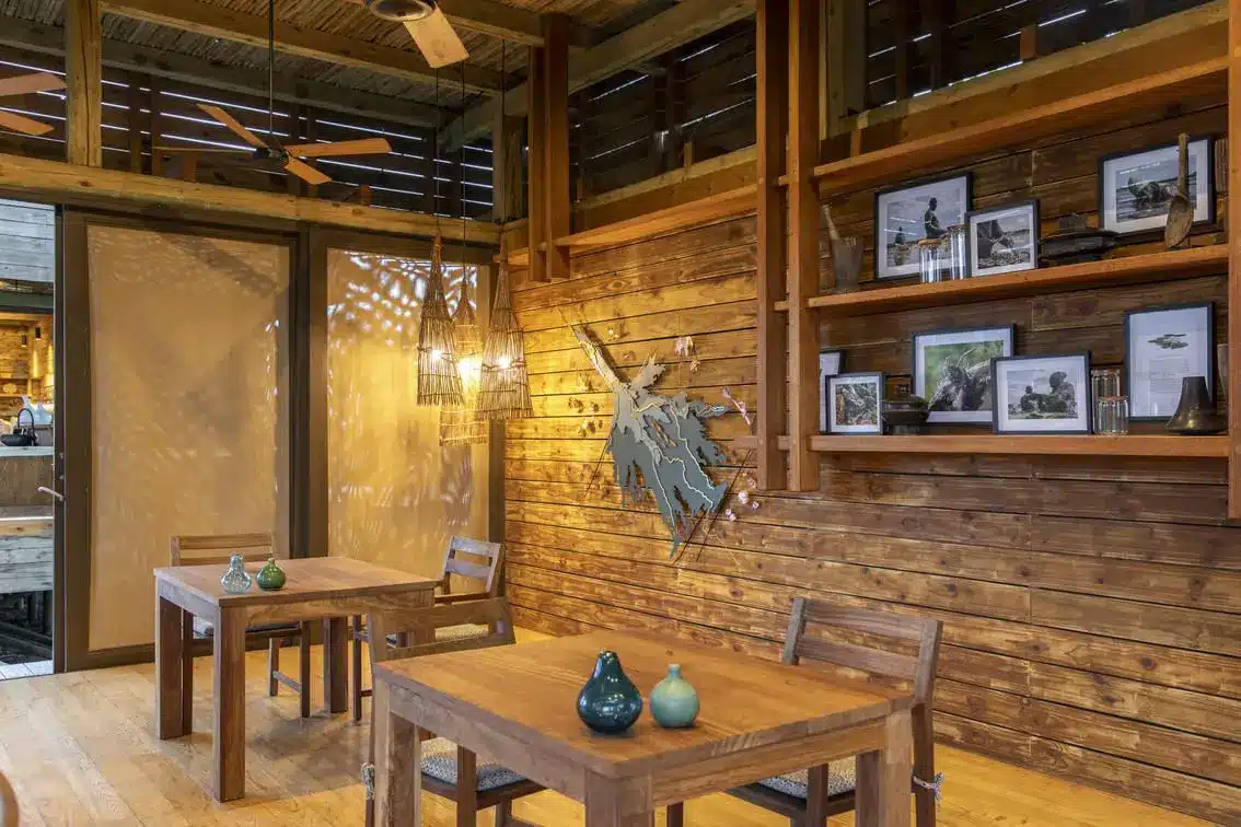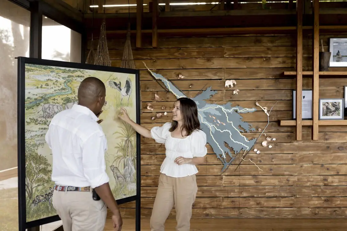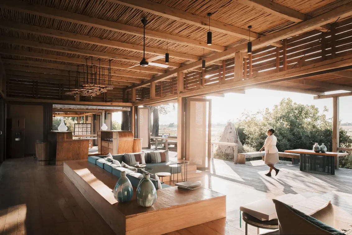 The camp consists of two separate satellite camps, each with its own main lounge, dining, and bar areas, but all under the Vumbura Plains umbrella. Each suite is spacious, with floor to ceiling glass walls that open onto private decks with plunge pools and seating areas. Interiors feature a modern and airy aesthetic with local artwork, luxurious linens, and en-suite bathrooms complete with both indoor and outdoor showers. Solar power provides electricity, and ceiling fans help keep interiors cool. Main areas include elevated viewing decks, a library, a gift shop, and open air dining spaces where meals are freshly prepared and often enjoyed under the stars.