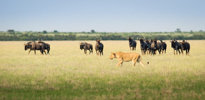 A famous fossil riverbed with lush grazing after rains, attracting large herds of animals and predators.
