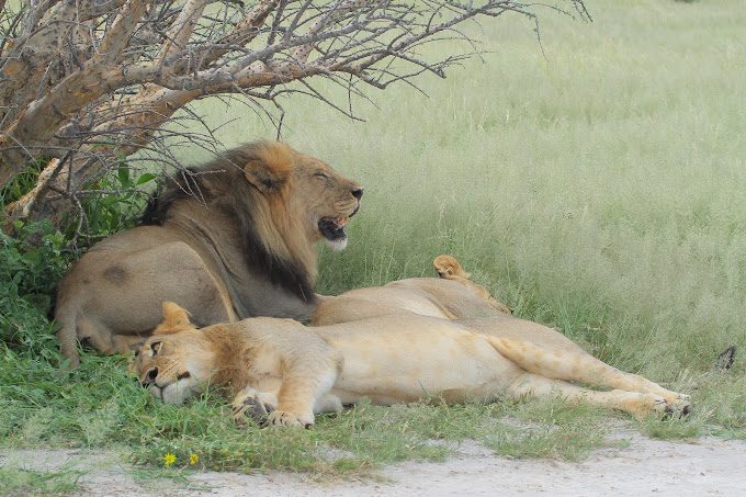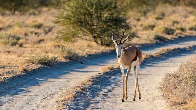 The reserve is dominated by vast open plains, fossil riverbeds, salt pans, sand dunes, and thorny acacia trees. It is home to a variety of wildlife, adapted to the harsh semi-arid conditions. There are predators like lions including the famous black-maned Kalahari lions, cheetahs, leopards, wild dogs, and hyenas. Herbivores like the springbok, oryx, eland, wildebeest, kudu, giraffe, and hartebeest.