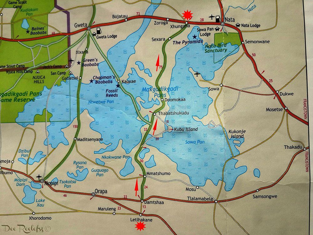 The park is approximately 160 km east of Maun (a 2–3 hour drive). The main entrance is accessible via a tarred road to Gweta, followed by dirt tracks into the park.