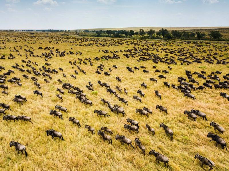 During the calving season (between January and March), many of the female wildebeest give birth to their young, dropping over half a million young in this incredible act of synchronized birthing. The grass provides little cover and the young are easy pickings for a variety of predators (cheetah, lion, hyena, and leopard). Wildebeest calves can run minutes after they are born and within 3 days they are normally strong enough to keep up with the herd. After a full day’s exploration, return to camp for dinner and overnight.